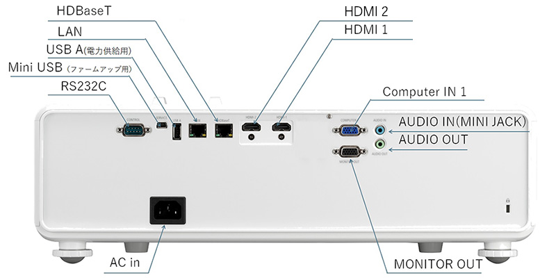 HDMI入力2系統をはじめ、アナログRGB入出力、HDBaseT入力に対応。また10Wモノラルスピーカーも搭載しています。