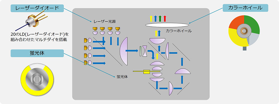 投写光を4カ所で周回させる4Kシフトアクチュエーターと専用の映像処理アルゴリズムを実装することにより、1画素を4つの疑似画素に分割して4K UHD解像度の投写を可能としている。