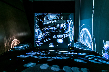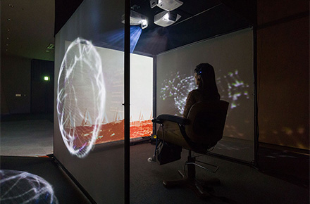 「NO-ON」は3面スクリーンの2m状のキューブ型の空間になっています。そのため、設置面では3台のプロジェクターをスクリーンから近い位置に設置する必要がありました。