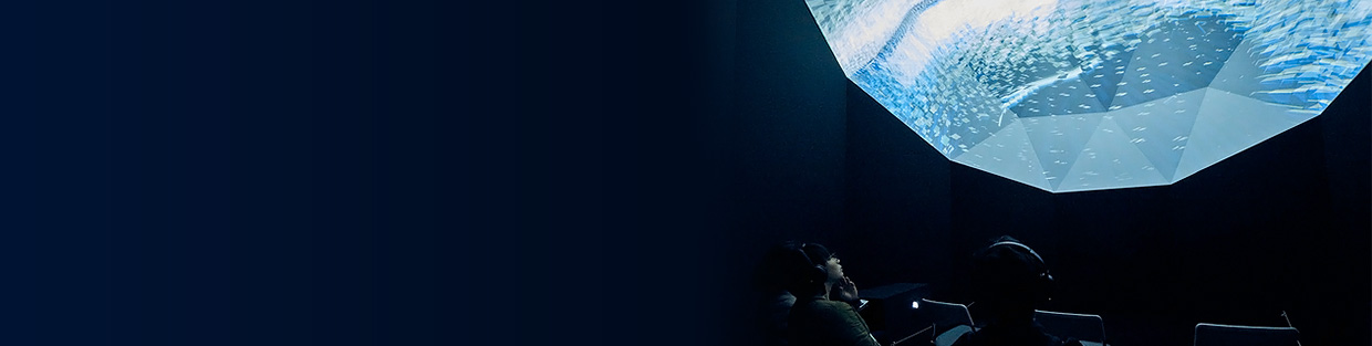 また、複数のプロジェクターを使用して、マルチ投写を行う時に便利な機能(エッジブレンディング)により、自動的に輝度差を調整し、つなぎ目がなめらかになり、視界を覆うドーム型スクリーン一杯に美しい大画面映像とヘッドフォンから流れる音楽により、作品への没入感をより深く味わえる展示となっている。