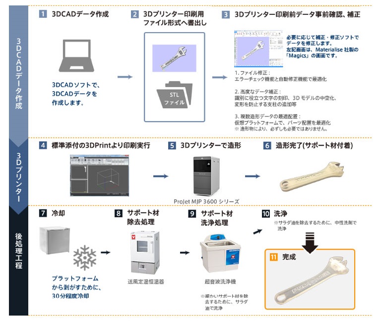 インクジェット | UV硬化型アクリル樹脂 | 紫外線硬化性の樹脂をインクジェットヘッドから吐出し、UV(紫外線)で硬化させて積層する方式。 |