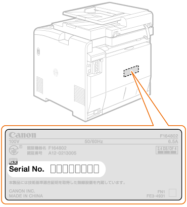 シリアルナンバーは、複合機背面のラベルに記載されている8文字の英数字です。