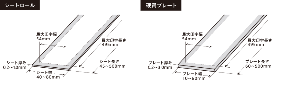 プリントできる銘板のサイズの自由度が高いのも魅力のひとつ。用途にあわせて大きさを設定できます。また硬質プレートなど厚口のマテリアルにもプリントできます。