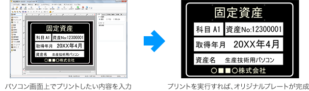 プレートの印字は従来の2倍、シートの印字は従来の約1.3倍にスピードアップ。仕上がりの美しさはそのままに、固定資産管理ラベル、レンタル・リース品の管理銘板、タイトルプレートなど幅広く作成できます。