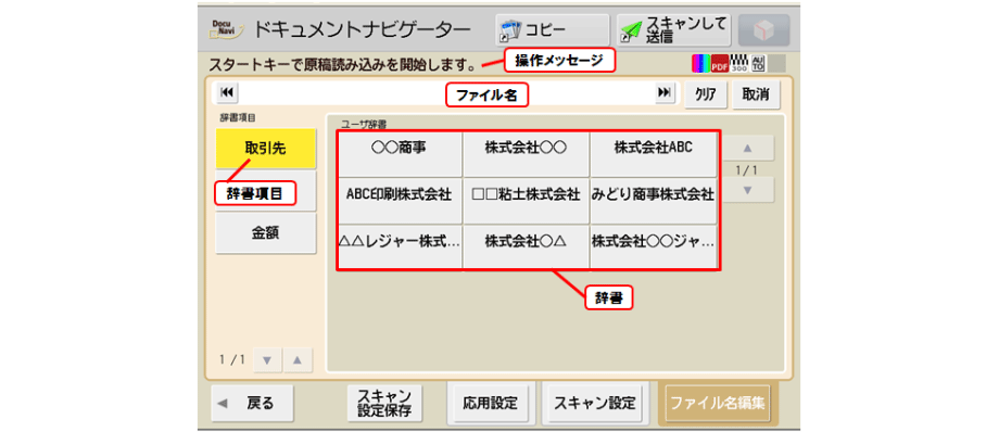 例えば、取引先や商品名などの辞書に登録されている名前を選択するだけでファイル名に入力できます。