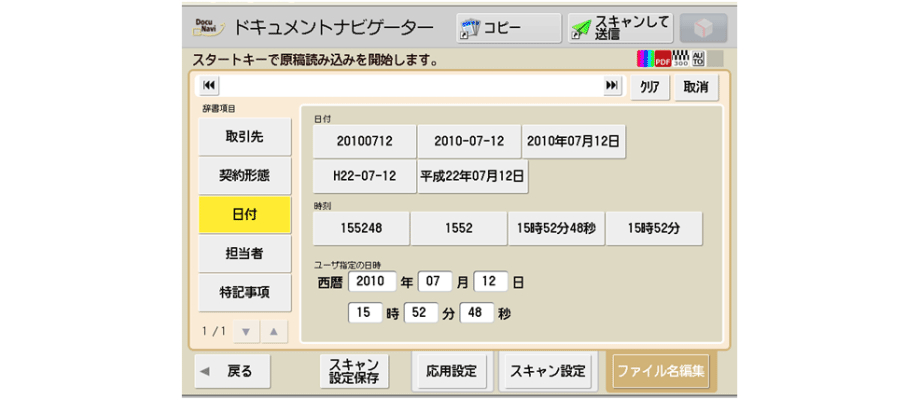 例えば契約書の作成日や締結日など、意味を持った日時情報もワンタッチでファイル名に付けられます。