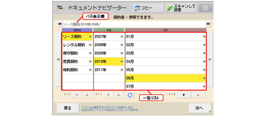 選択したフォルダーはパス表示欄に表示され、今どこにいるか常に確認できます。保存先が決まったら、[次へ]ボタンで、スキャン設定画面へ進みます。大変分かり易い操作性で、目的の『文書登録先』まで的確にナビゲートしてくれます。