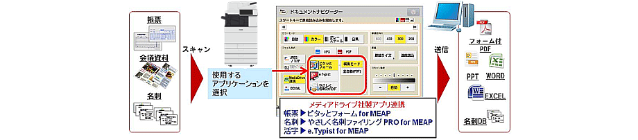 メディアドライブ社製のPCアプリケーション※と連携し、Document Navigatorからフォーム付PDFやOfficeデータに変換できます。