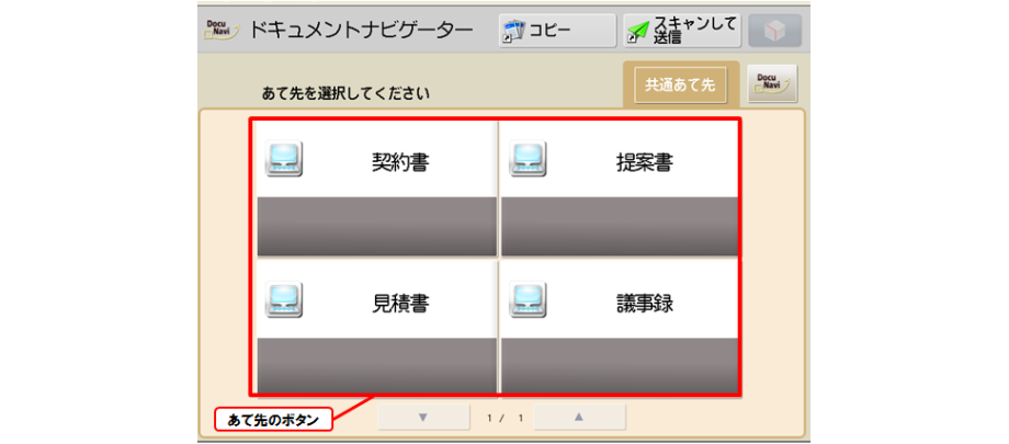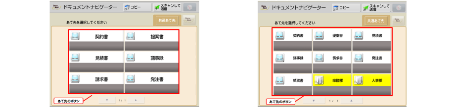 『スキャンした文書データ』や『印刷する電子データ』の保存先を見つける場合、[あて先ボタン]から選択をはじめます。業務内容・文書名・部署名など、『誰が見ても分かり易い業務ボタン』を設定できます。