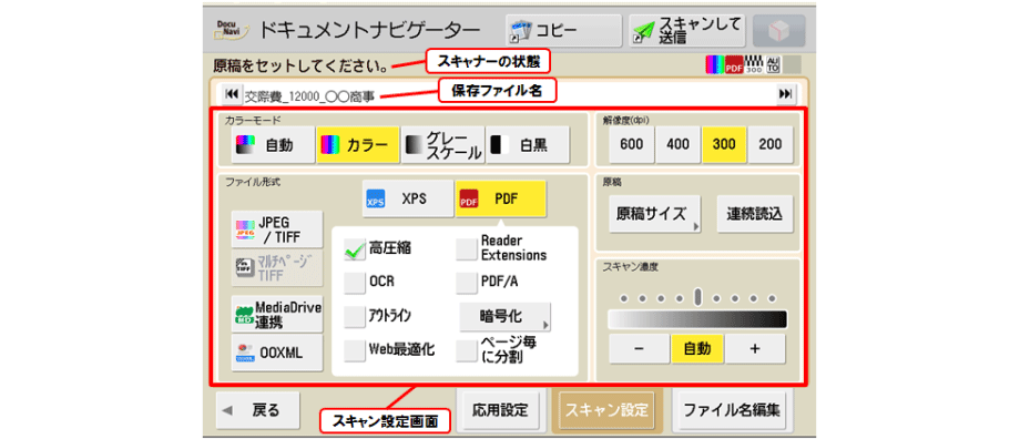 スキャン設定で、ファイル形式や解像度などさまざまな設定を行うことができます。複合機のスキャン機能を最大限に活用した紙文書の電子化を行うことができます。