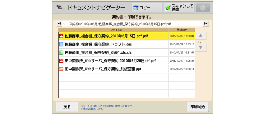 印刷設定の変更などはできませんが、印刷したい文書のあるPCに行かなくても、複合機から印刷することができるので便利です。例えばよく使う報告書のテンプレートなどを現場の複合機で印刷し、手書き記入した紙文書をスキャンして文書登録するなど日常業務に応用できます。また複合機からその場で印刷するため、放置プリントの防止にもつながります。