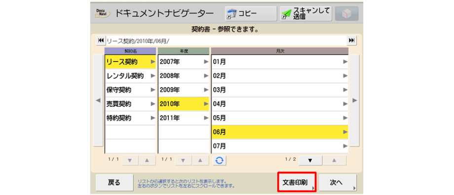 4D-JASプロトコルを使った場合は、フォルダー選択画面で[文書印刷]ボタンが表示され、文書印刷をすることができます。
