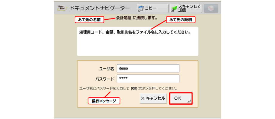 あて先を選択すると、あて先の名前と説明文を表示した、ユーザー認証画面が表示されます。