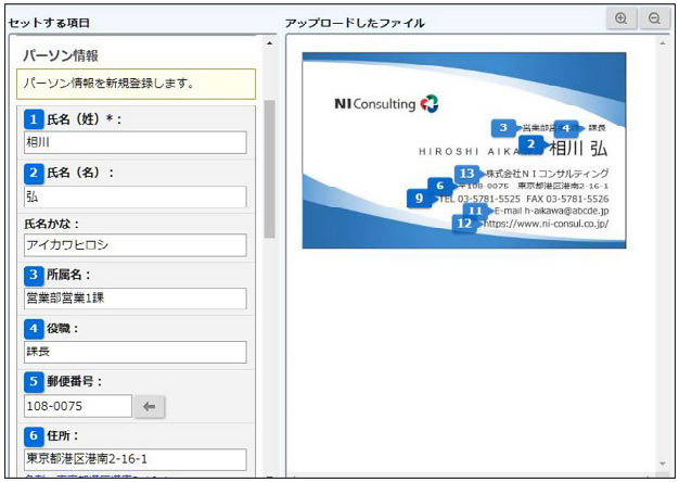 MEAP クラウドスキャン for NI Collaboは、複合機でスキャンした名刺データをバスケット経由でSales Force Assistantのパーソン情報※へ連携できます。スキャン時には、原稿台ガラスの上に複数枚の名刺を並べ一度で取り込みが可能です。また名刺の顧客情報はOCR処理により自動で入力されます。
