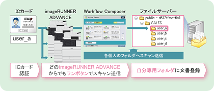 個人認証の仕組みと連携することでネットワーク上のどの複合機からでも自分専用のフォルダーへ簡単にスキャン送信する運用が可能です。