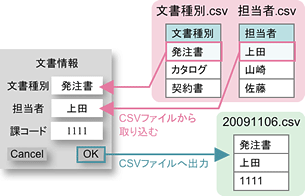 CSVファイルの情報を、デバイスのプルダウンメニューに表示・選択できます。また、デバイス上で入力した情報をCSVファイルとして出力することができます。複合機での操作性をより一層向上させます。