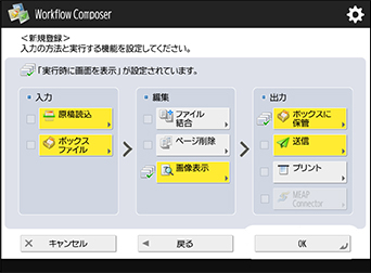 出力工程では、入力工程で選択された文書や編集工程で編集された文書の出力方法を[ボックスに保管※(ユーザーボックスに保管)]、[送信( Universal Send機能を用いてe-mailやI-ファクス、ファイル、ファクス送信先に送信)]または[プリント※(指定した印刷設定でプリント)]から選択できます。