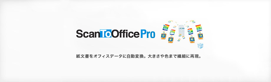 ScanToOffice Proは、複合機でスキャンした紙文書を手軽に実用性の高いオフィスデータに変換するMEAPアプリケーションです。複合機から指定したパソコンに送信したスキャンデータを、クライアントPC側アプリケーションScanToOffice ClientでOCR処理し、Microsoft Word、Excel、PowerPoint、一太郎ファイル、PDFファイルなどに変換します。