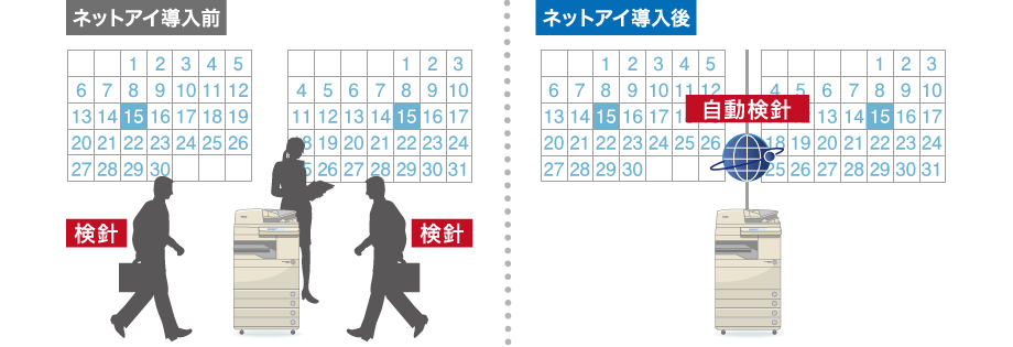 定期的にサービス担当者が訪問して行うカウンター(複合機の使用枚数)の検針作業を、インターネットを通じてお客さまの指定日に自動検針いたします。