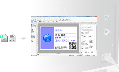 専用ソフトを使用すれば、上位システムから出されたCSVデータをワンタッチで一括取り込みが可能。診察案内などの挿入も年賀状ソフトの感覚で簡単です。