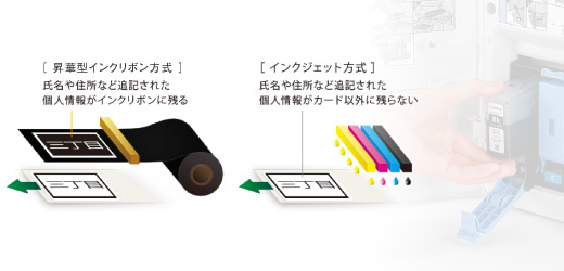 キヤノンのカードプリンターはインクジェット方式。 昇華型方式のように印刷後のインクリボンに情報が残らないので、個人情報漏洩を防げます。