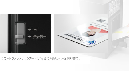 ICカード、プラスチックカードに加え、名刺などの紙の印刷も、たった1台で対応可能