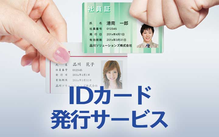 就業管理や入退室管理、食堂精算などのさまざまなシーンで利用する、社員証/学生証/会員証/資格証など、氏名や顔写真、バーコードなどが印刷されたIDカードの発行を行うサービスです。