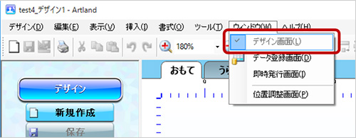 2.Artlandを起動し、メニューから[ウィンドウ]-[デザイン画面]をクリックします。