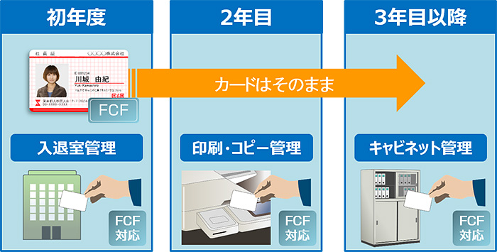上述の3つのメリットを持つFCFなら、FeliCa共通のフォーマットを使用しているため、FCF対応のICカードはそのままで、将来的に既存のICカードを活用したシステム拡張も容易にできます。