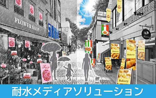 耐水メディアソリューションラミネート無しで最長6カ月の屋外掲示を実現。屋外ポスターの内製化が可能です。