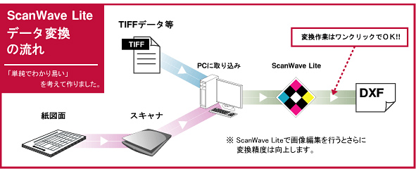 2053V168 | 59,800円 | ScanWave Liteは、スキャナーで紙図面を読み込み、読み込んだイメージデータを簡単にCADの中間フォーマットであるDXFデータに変換できるラスタベクタ変換ソフトです。必要な部分だけを変換したい場合や、大きいサイズの図面にあった変換設定値を探すときに、図面の一部分のみのラスタ・ベクタ変換を行うことも可能です。 |
