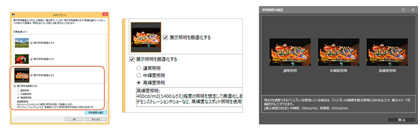 従来の展示照明よりも強い照明をあてた場合、明部の色飛び、シャドーの暗さが不足するなど見え方が変化します。Professional Print&Layoutは高輝度照明による展示の見え方の違いを補正して、自然な見え方になるようにプリントします。