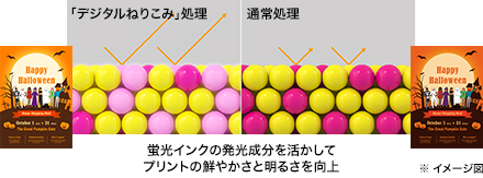 蛍光インクを使用した場合、蛍光インクの一般的な特性上、耐光性及び光沢感は他のインクと比べ弱くなります。
