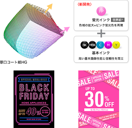 水性顔料大判インクジェットプリンターとして世界初※の蛍光インクを搭載しているため、ピンクでの蛍光色表現が可能になるとともに、主にマゼンタからイエローにかけて明度方向に色域拡大しています。明るい、楽しい、ポジティブ、軽やかなどのイメージがある蛍光ピンクは、セールや季節のポスターなどに最適です。蛍光色はネオンのような発光感を表現でき、通常のポスターとは異なるインパクトのある訴求ができます。