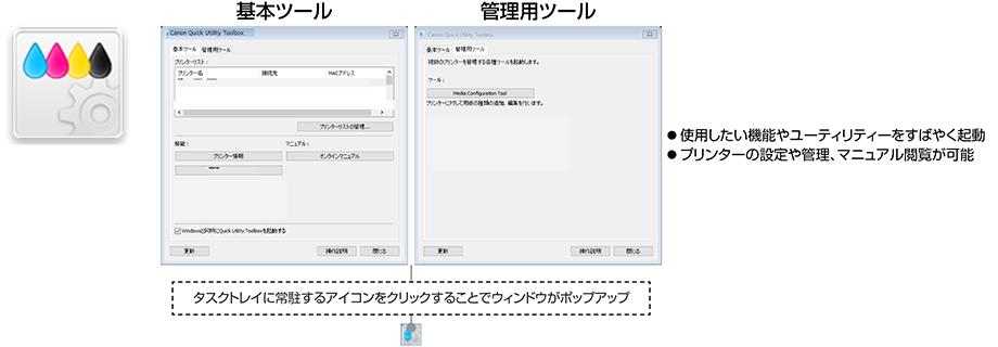 Quick Utility Toolboxの基本ツールで使用するプリンターを登録すると、使用可能な機能が表示されます。登録されたユーティリティーを素早く起動してプリンターの設定や管理をしたり、オンラインマニュアルにアクセスして閲覧することができます。