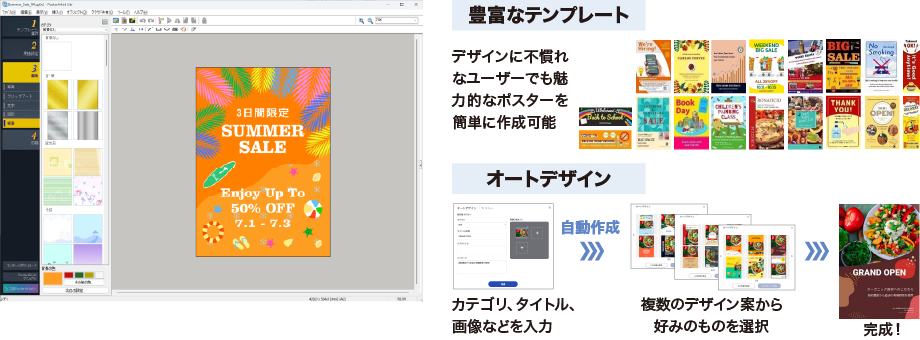 直感的な操作で、誰でも簡単にデザイン性の高いポスターやチラシなどを作成可能です。Windows版はオフライン環境でも使え、インターネットへの接続が制限されている業務用PCなどでの利用においても便利です。