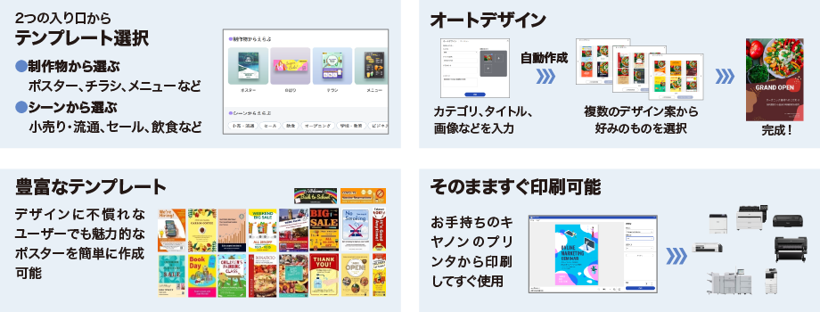直感的な操作で初心者でも簡単にデザイン性の高いポスターなどを作成可能です。キヤノンの家庭用プリンターPIXUSシリーズ、ビジネス向けプリンターGXシリーズ、Sateraシリーズ、オフィス向け複合機imageRUNNER ADVANCEシリーズ、大判プリンターimagePROGRAFシリーズなどで印刷でき、既に対応機種をご利用いただいているユーザーにも新たなプリント価値を提供します。