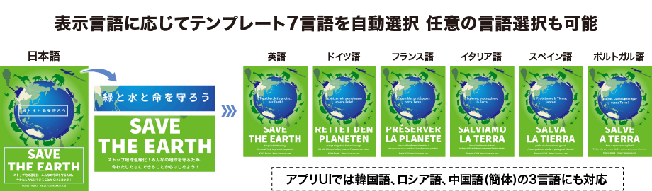 日本語と英語に加えて、ドイツ語、フランス語、イタリア語、スペイン語、ポルトガル語のテンプレートを追加。OSの表示言語に合わせて、7言語から自動で選択されるため便利です。また、任意の言語選択も可能です。