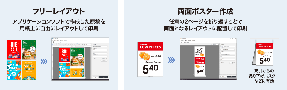 Microsoft Office(Word、Excel、PowerPoint)からそのまま大判サイズで出力できるプラグインソフトウエア「Free Layout plus」。Microsoft OfficeやPosterArtistだけでなくさまざまなアプリケーションで作成した文書を簡単な操作で手軽に大判サイズにプリント可能です。