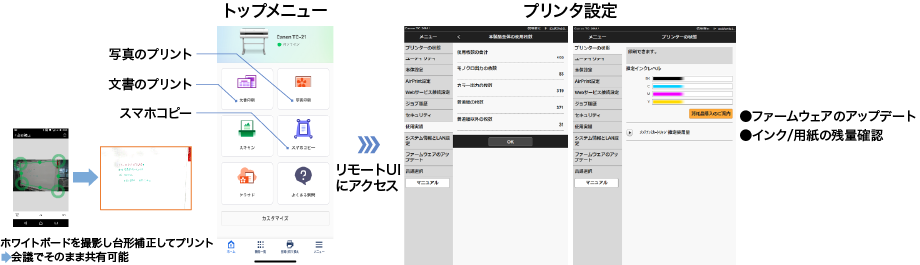 TCー21シリーズは、モバイルプリントアプリケーション「Canon PRINT」に対応しスマートフォンやタブレットから簡単に文書や写真の大判サイズでのプリントができます。また、印刷実行に留まらず、プリンターの状態の確認や各種設定などを行うソフトウエア「リモートUI」にアクセスして、ロール紙やインクの残量の確認、インクの型番情報の確認、アニメーションを交えたマニュアルの閲覧、などができます。