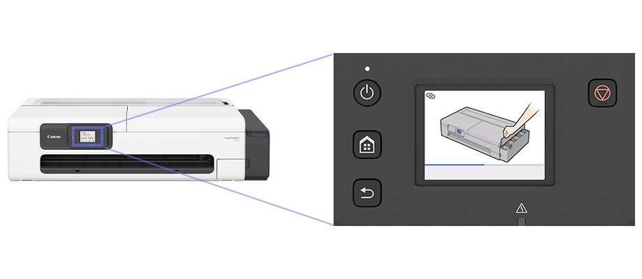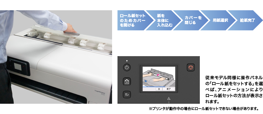 カバーを開け、ロール紙をセットして、操作パネルで用紙種類を選択するだけで給紙が完了。ロール紙セットのガイドを操作パネルに表示させることも可能です。誰でも簡単にロール紙のセットを行うことができます。