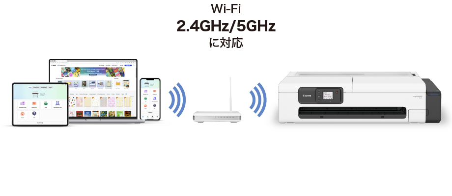 電波が遠方まで届いて障害物にも比較的強い2.4GHz帯と、電波が干渉しにくく安定して接続できる5GHz帯に対応。使用環境に応じたネットワークでプリンターと接続できます。