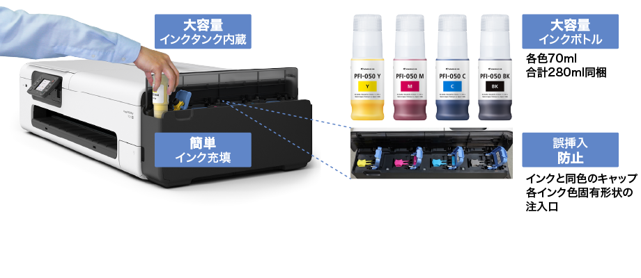 プリンタ本体に大容量インクタンクを内蔵し、各色70mlの大容量インクボトルを同梱。また、インクボトルを挿すだけで容易に充填でき、インクボトル差し込み口の色と形状を各色で変えることで入れ間違いを防止します。
