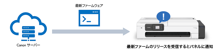 最新ファームウェアのリリースを受信すると、プリンタ本体の操作パネルに表示。PCレスで操作パネルからファームウェアを更新することができます。また、リモートUIを使ったファームウェアの更新も可能です。