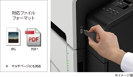 USBメモリーをプリンターのUSBポートに接続することで、PCを使わずにメモリー内のファイルのダイレクト印刷が可能。印刷プレビューを確認してから印刷実行でき、ファイル選択やプリントミスを防止します。