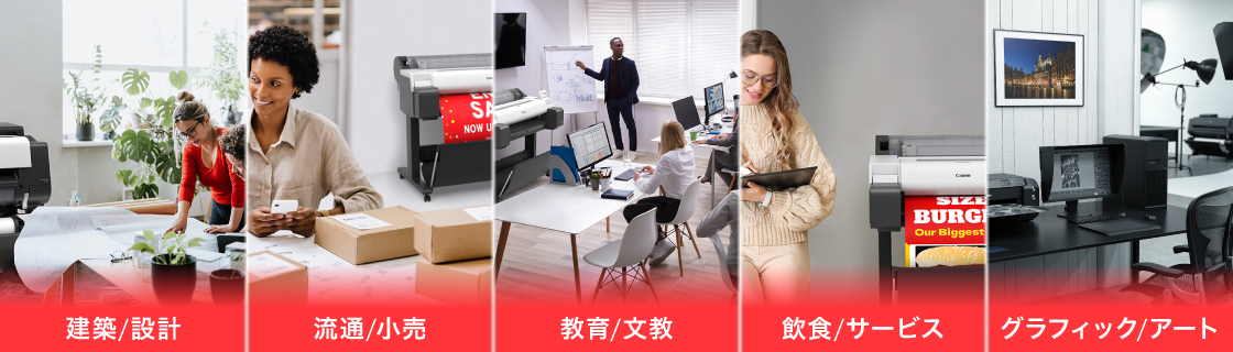 キヤノンの大判プリンターは、様々な業種の多様なニーズに対応。例えば、設計・建築業での「CAD・パース図の細線をくっきり描き、雨でも滲みにくくしたい」流通・小売業での「店頭ポスターのフチなし印刷をしたい、色褪せもしにくくしたい」教育・文教業での「教材の拡大印刷を簡単にしたい、スリープ状態からすぐに使いたい」飲食・サービス業での「ポスターを鮮やかにして、もっと集客につなげたい」グラフィック・アート業での「高品位な出力で芸術性を高めたい」など、あらゆるご要望にお応えします。印刷品質と生産効率を高める充実の機能が、あなたの現場でもきっと大活躍します。