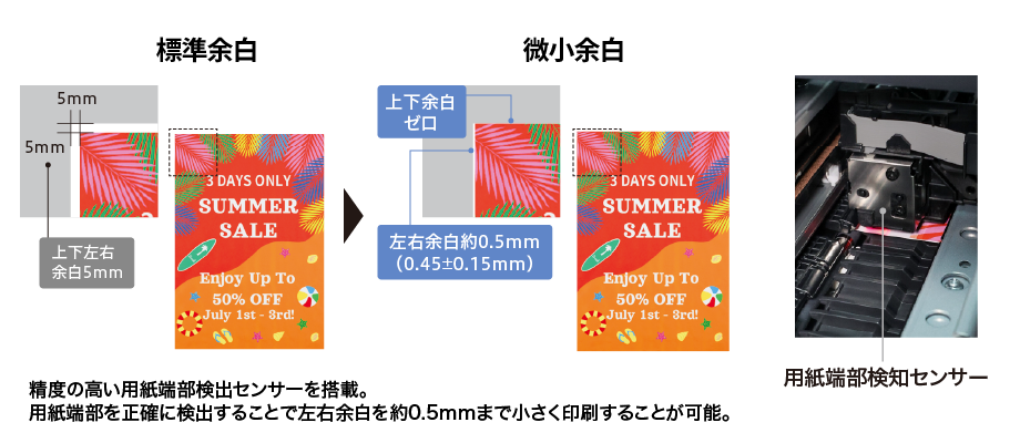 ロール紙印刷で上下ゼロ・左右約0.5mmの極小余白を実現。従来比1/10でカット作業を軽減し、フチなしポスター制作が容易に。