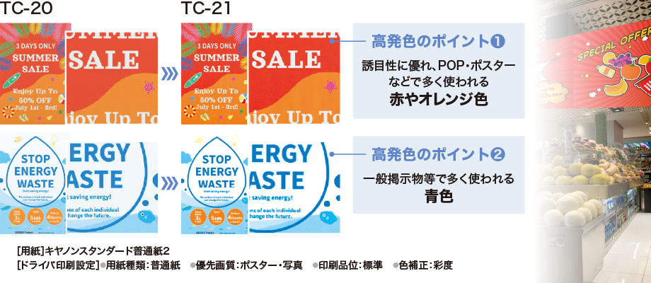 新画像設計でポスター画質が向上。赤・オレンジ・青など高発色を実現し、POPや掲示物の誘目性が大幅アップ。