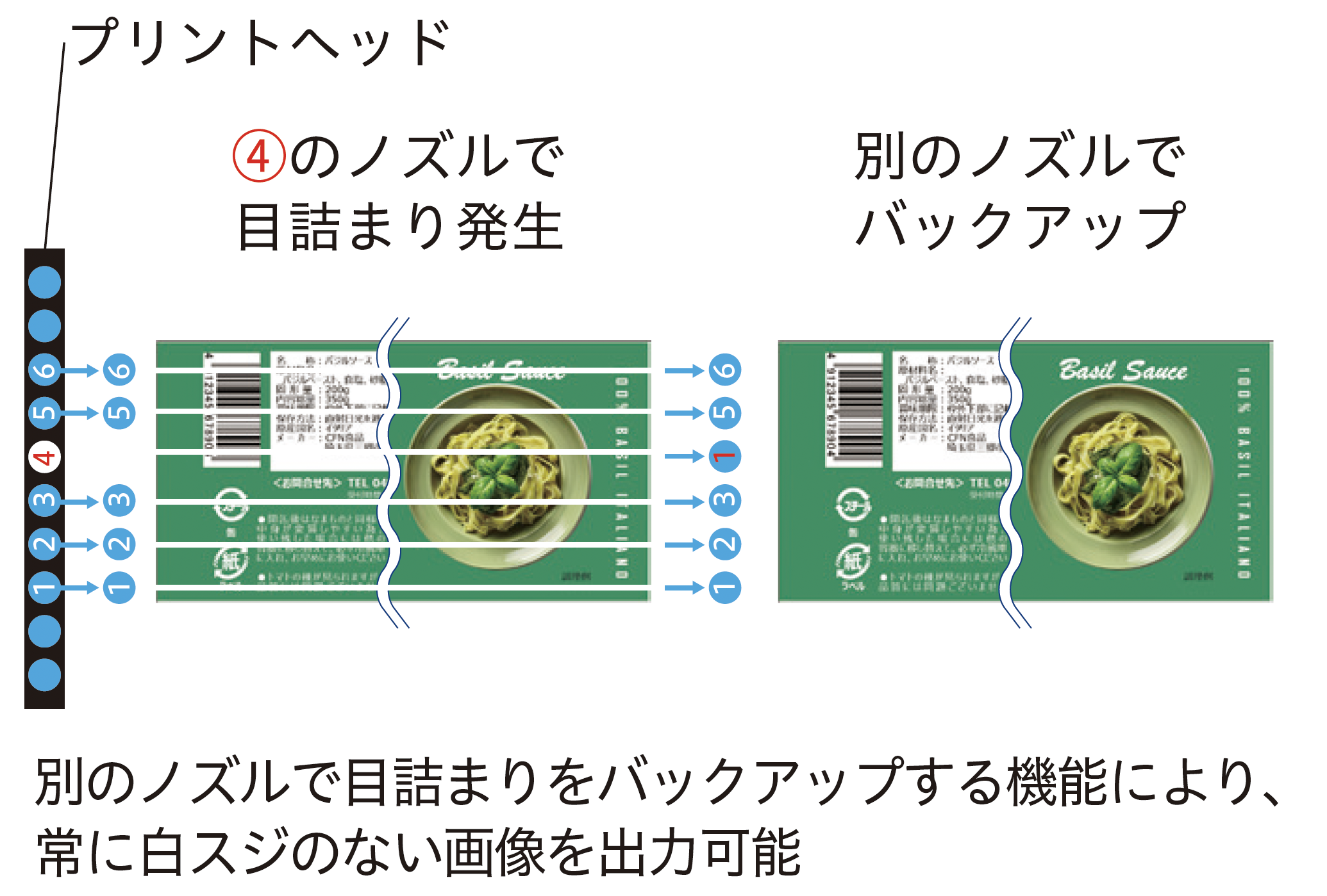 プリントヘッドのノズルからのインク吐出をセンサーで精密にチェック。目詰まりを検知すると別のノズルによって自動的に補完します。目詰まりによる色ムラなどの失敗プリントを低減するほか、目詰まりを解消するためのヘッドクリーニングを減らして、インクのムダを抑制します。また、目詰まりが多く補完しきれない場合には、クリーニングの実行を促す機能を搭載しています。