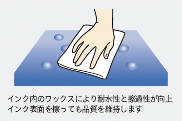 インクにワックス成分を配合することで、滑り性が付与され、耐水性と擦過性が向上しました。食品・飲料や化学薬品などラベル画像の堅牢性が求められる環境下での使用に対応し、物流時から店舗における陳列時まで、商品のイメージを損なうことなく、確かな品質を届けます。